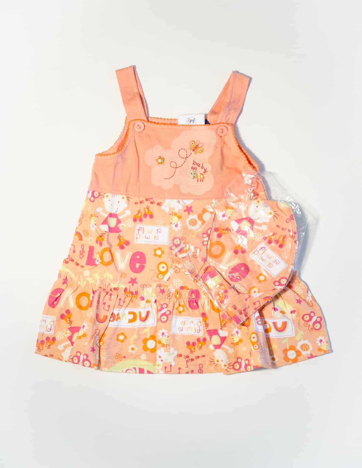 Komplet dětských bavlněných šatů a šátečku, zdobený veselou výšivkou a potiskem.