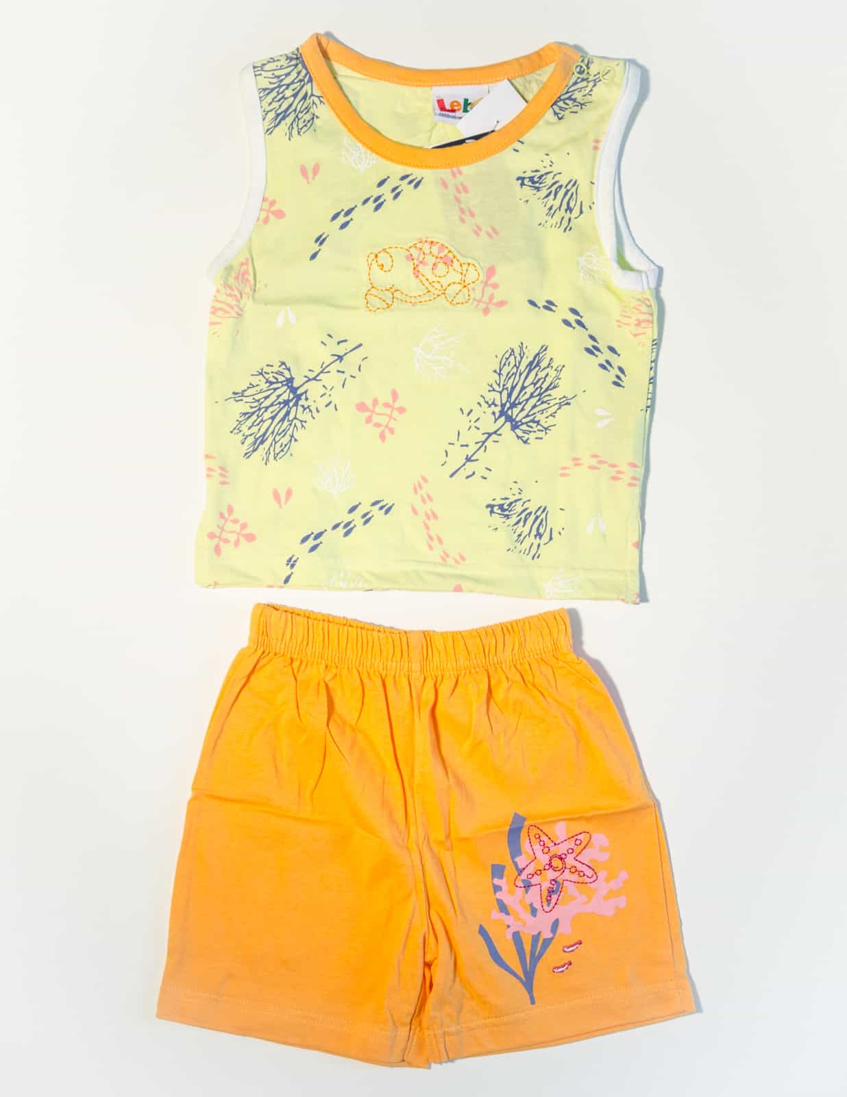 Bavlněný komplet krťasů a tílka, zdobený nášivkou a potiskem.