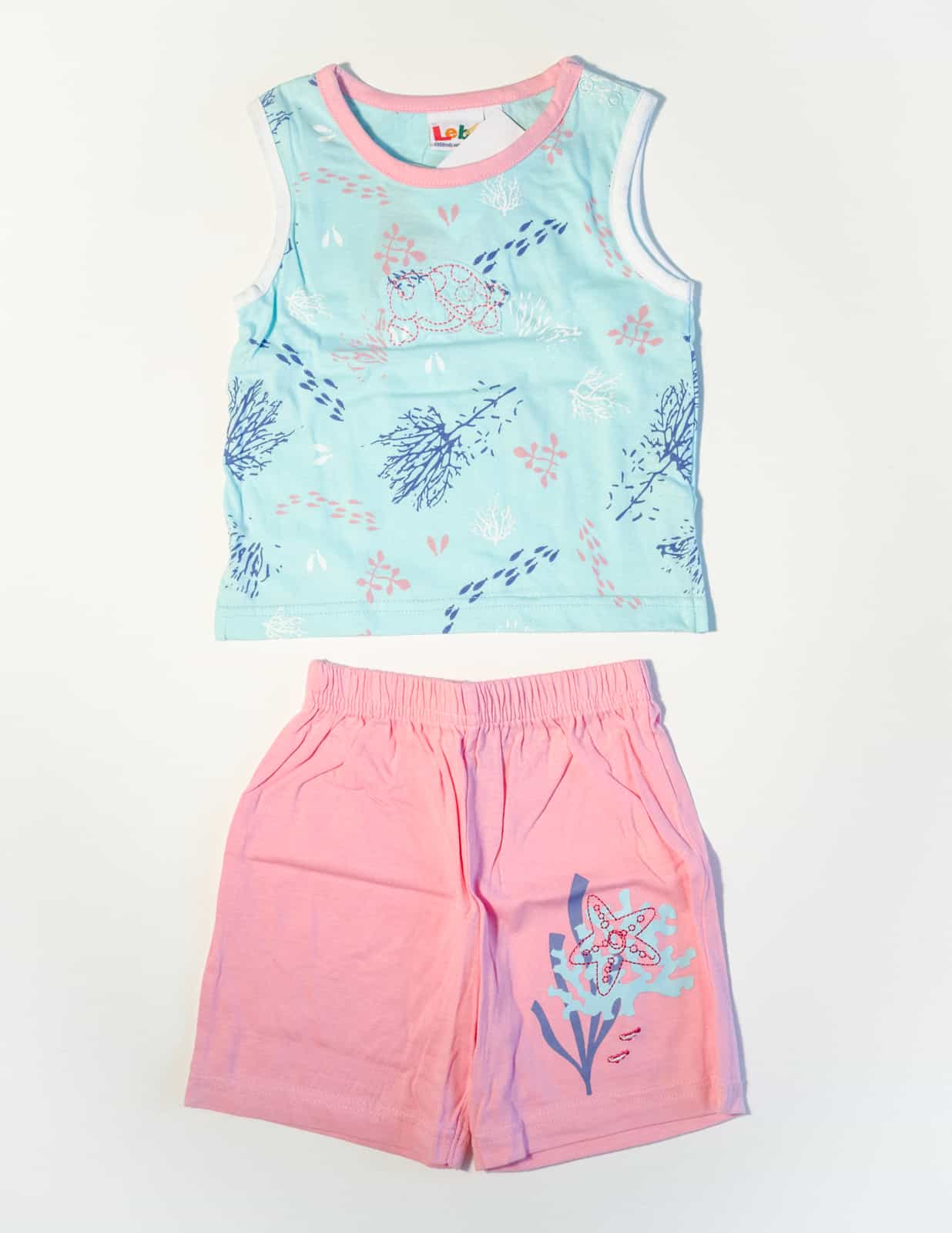 Bavlněný komplet krťasů a tílka, zdobený nášivkou a potiskem.Materiál: 100% bavlnaBarva: Růžová, světle modráVelikost: 12M (80) / 18M (86) / 24M (92) celý popis