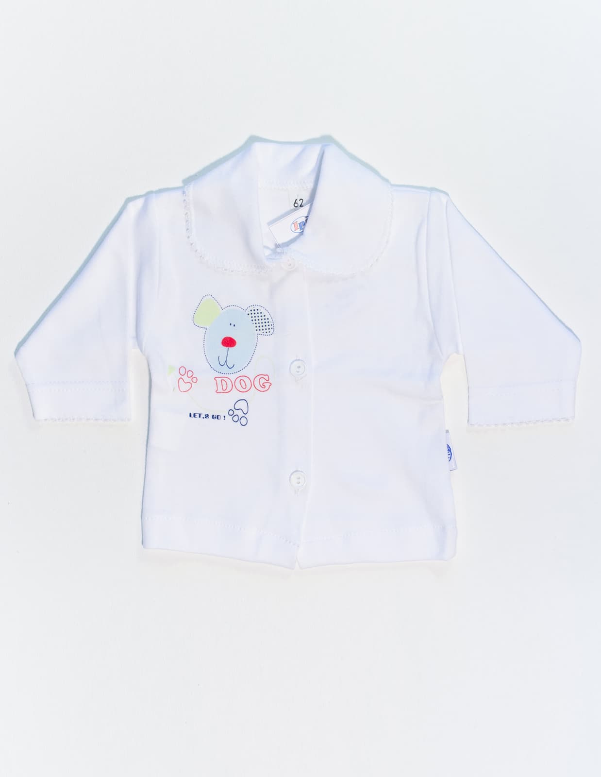 Kojenecká košilka s límečkem a praktickým zapínáním na knoflíčky, zdobená potiskem.