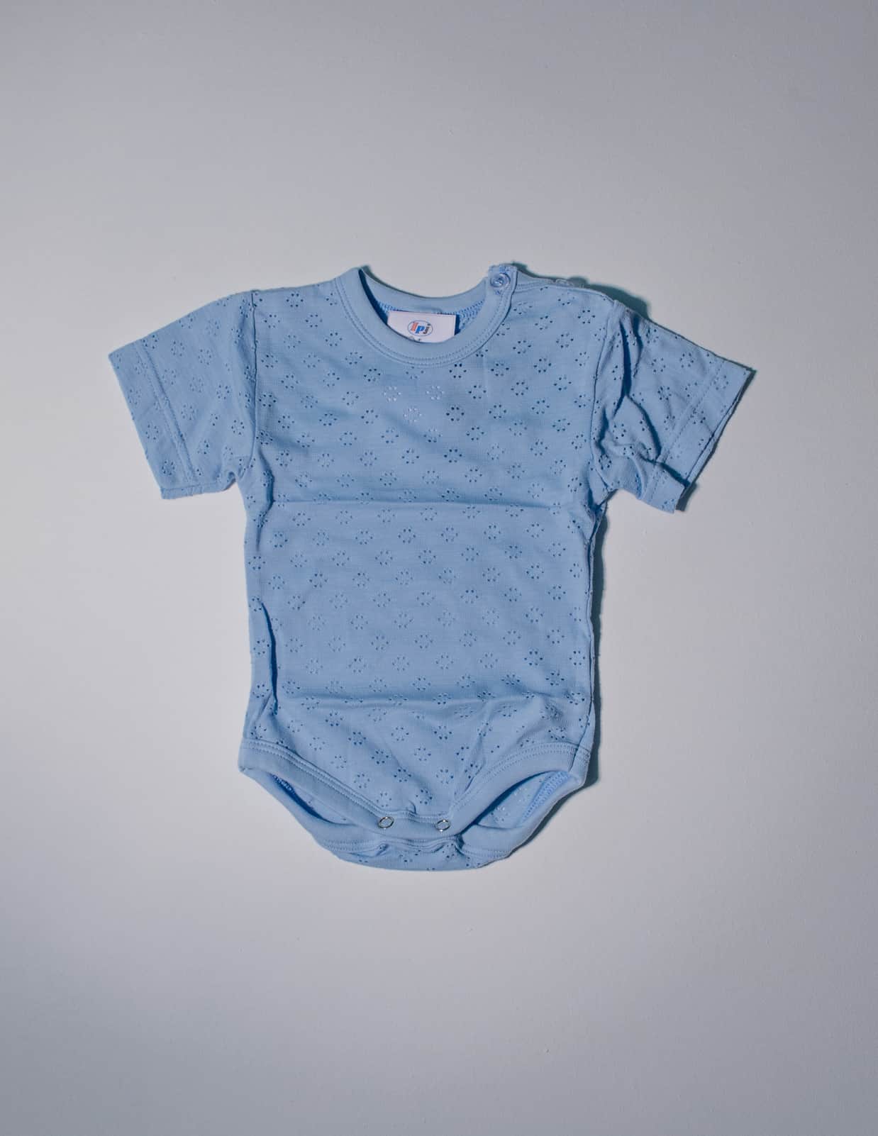 Lehké kojenecké body s krátkým rukávem, zdobené perforací.
