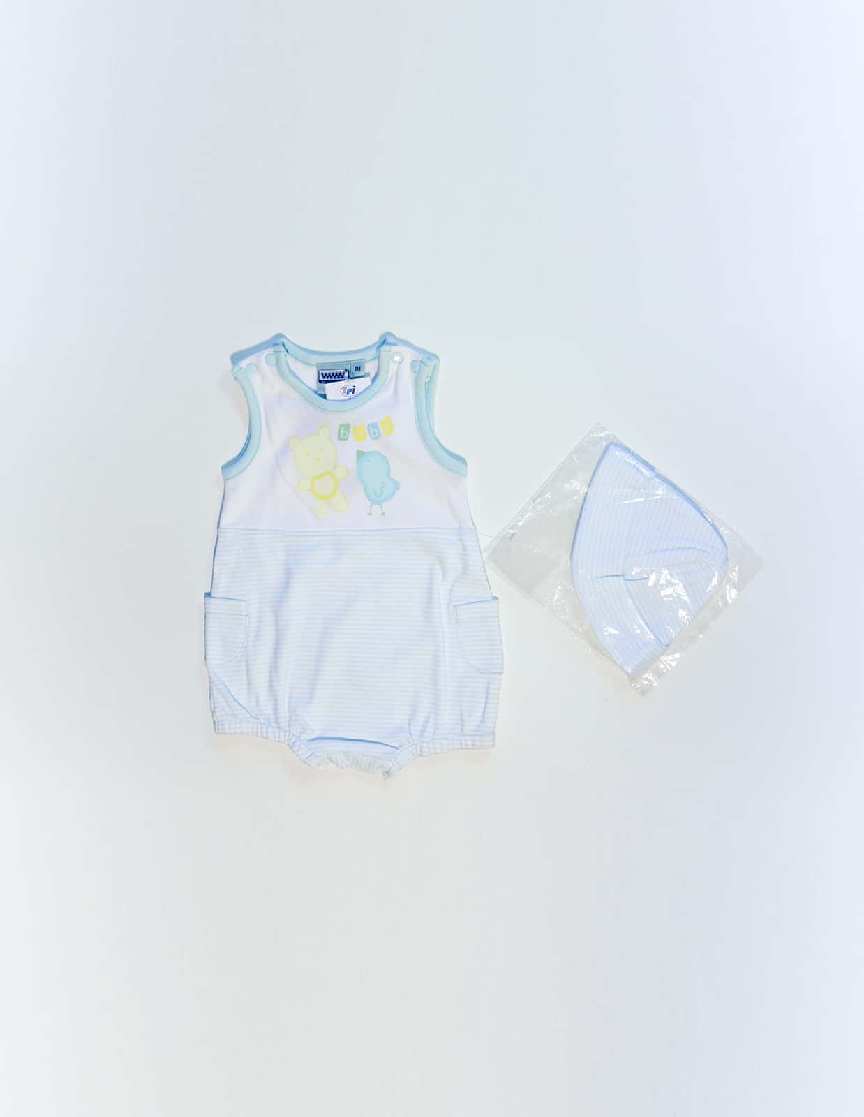 Komplet kojeneckého body s čepičkou, zdobený  potiskem zvířátekMateriál: 100% bavlnaBarva: Bílá, Světle modráVelikost: 3M (62) / 6M (68) celý popis