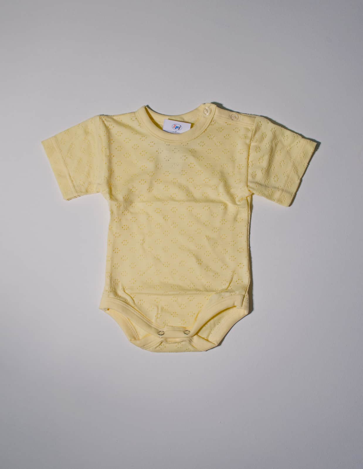 Lehké kojenecké body s krátkým rukávem, zdobené perforací.