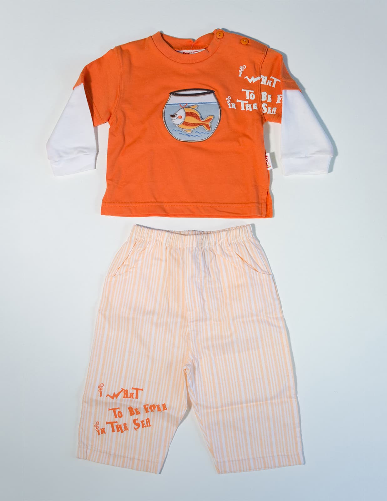 Veselý letní kojenecký komplet trička a plátěných kalhot, zdobený nášivkou a potiskem.