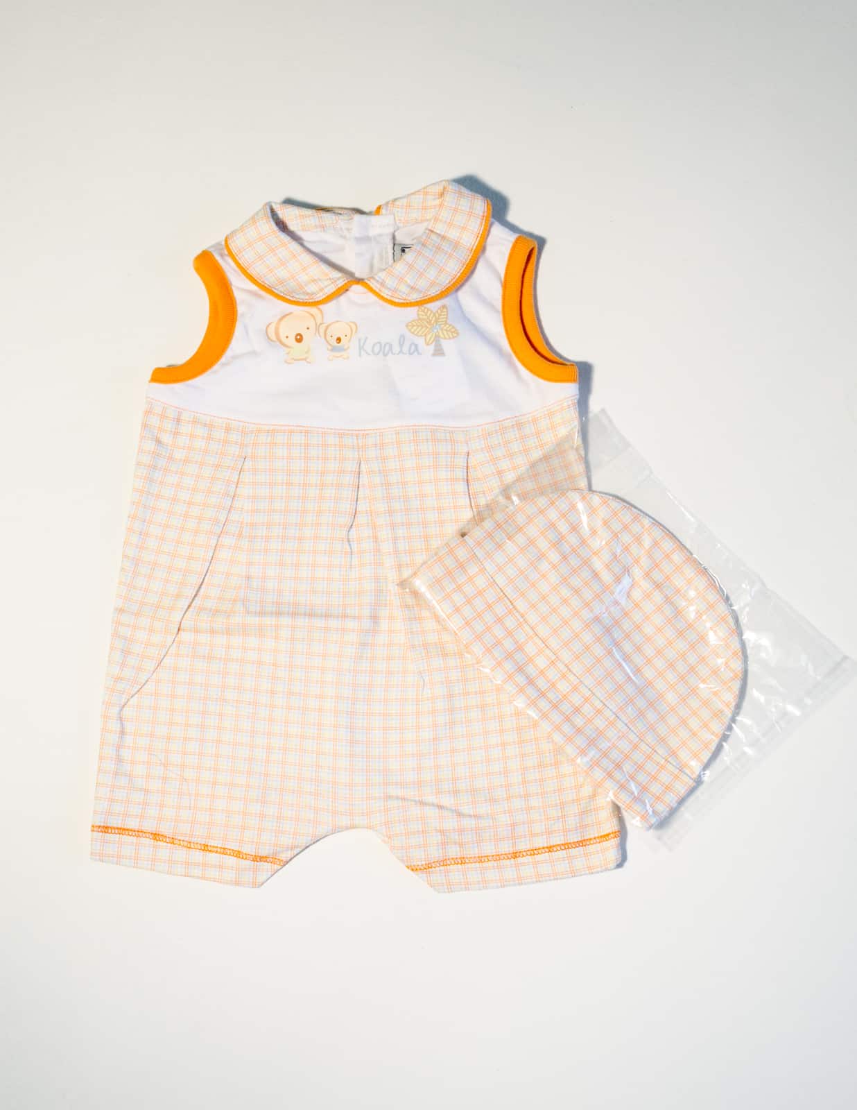 Letní bavlněný komplet overalu s čepičkou, zdobený potiskem.