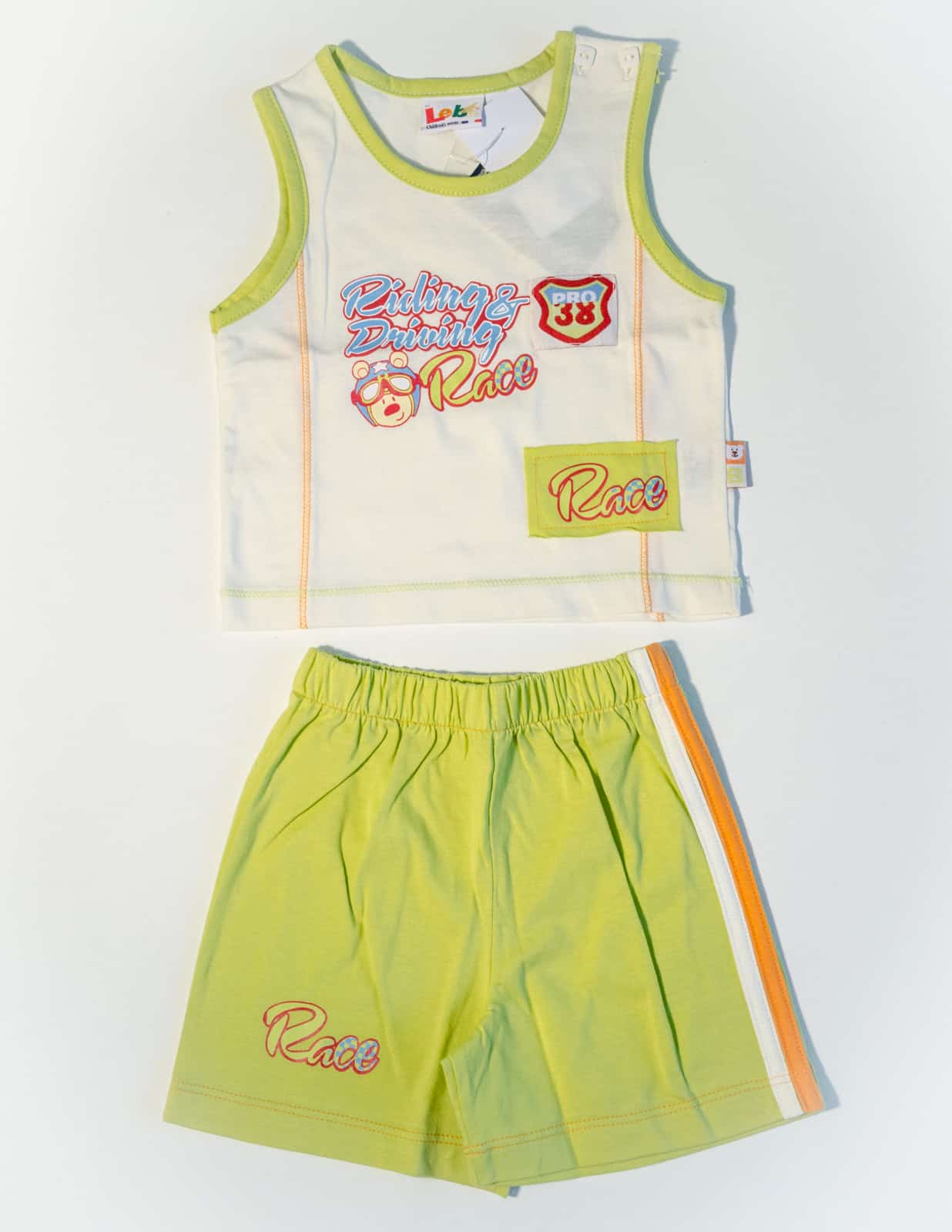 Letní bavlněný komplet pro malé závodníky. Tílko s kraťasy je zdobené potiskem a nášivkami.