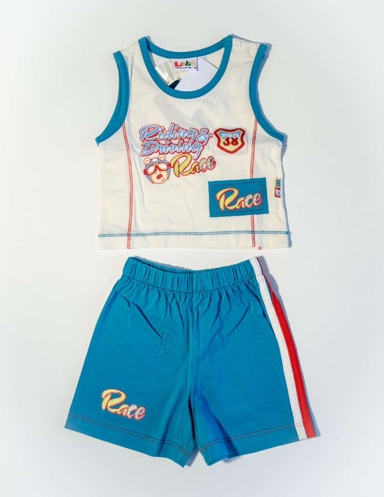 Letní bavlněný komplet pro malé závodníky. Tílko s kraťasy je zdobené potiskem a nášivkami.