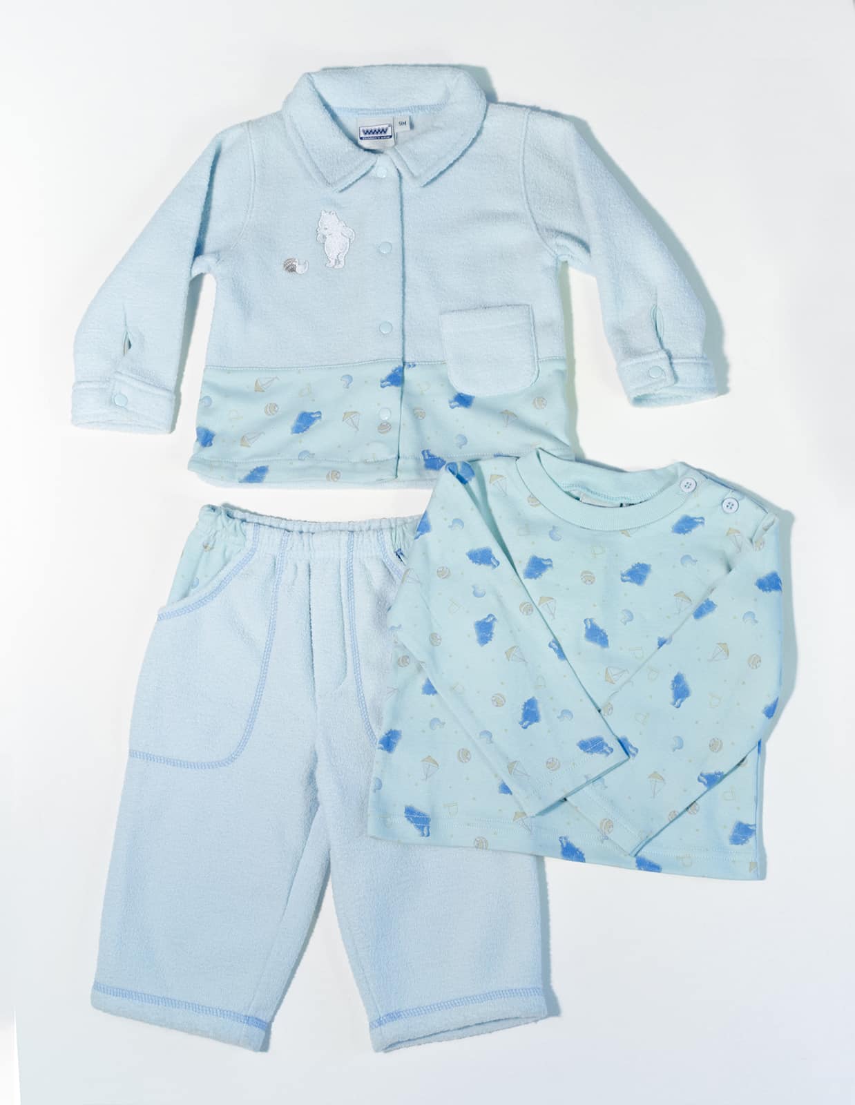 Kojenecký komplet kalhot, trika a mikiny se zapínáním na patentky. Zdobeno výšivkou a potiskem.