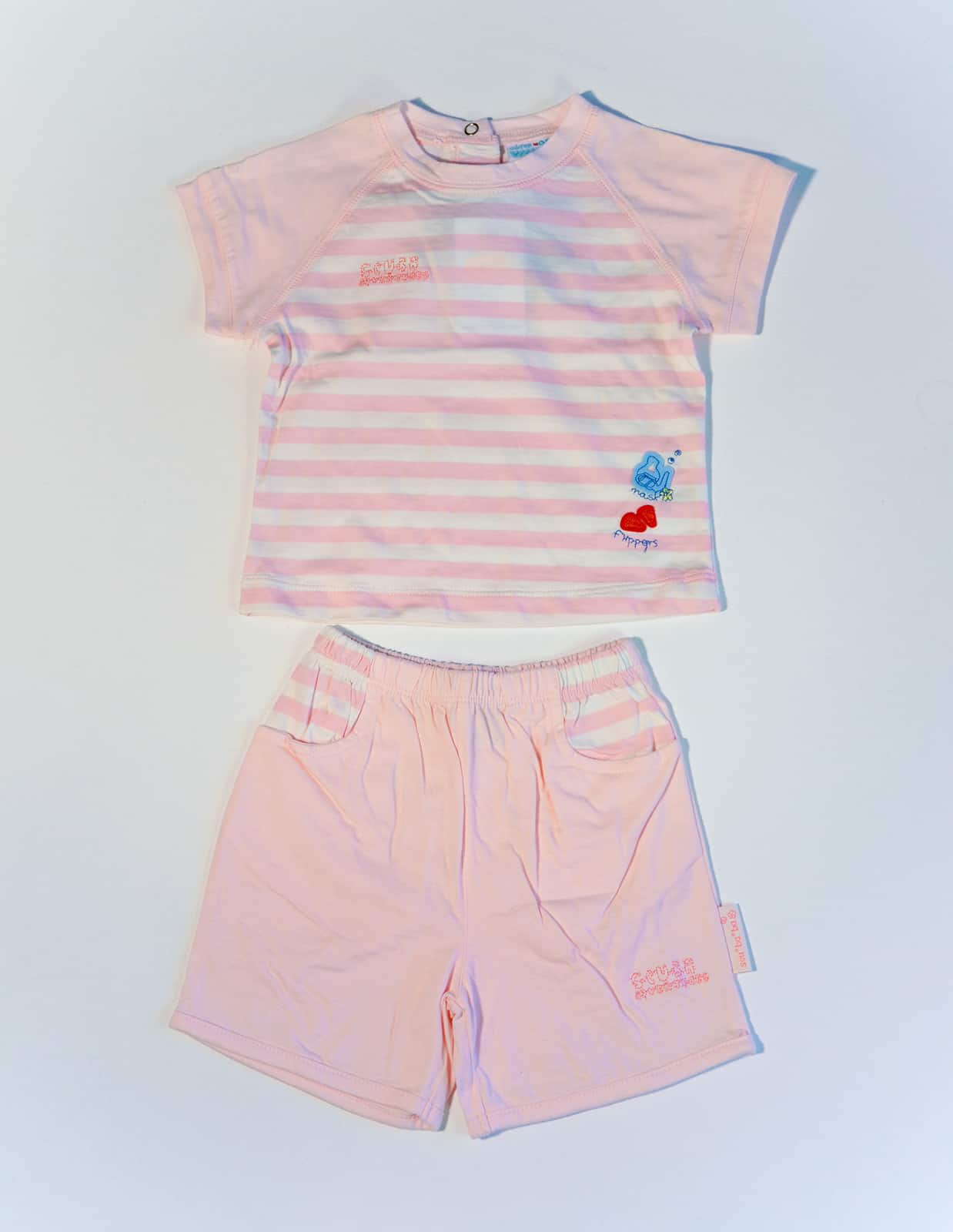 Letní kojenecký komplet kalhotek a trička, zdobený výšivkou a nášivkou s motivem potápění.