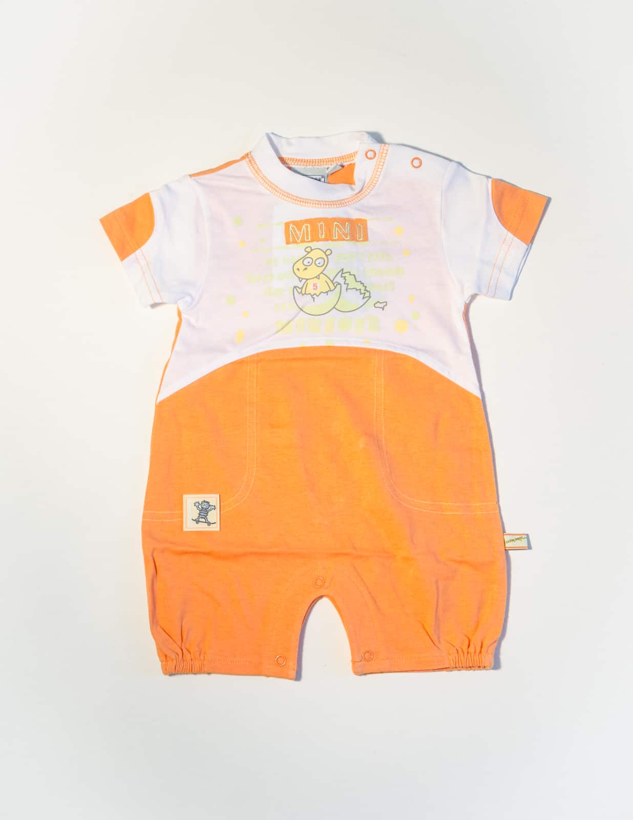 Bavlněný overálek, zdobený nášivkou a potiskem.