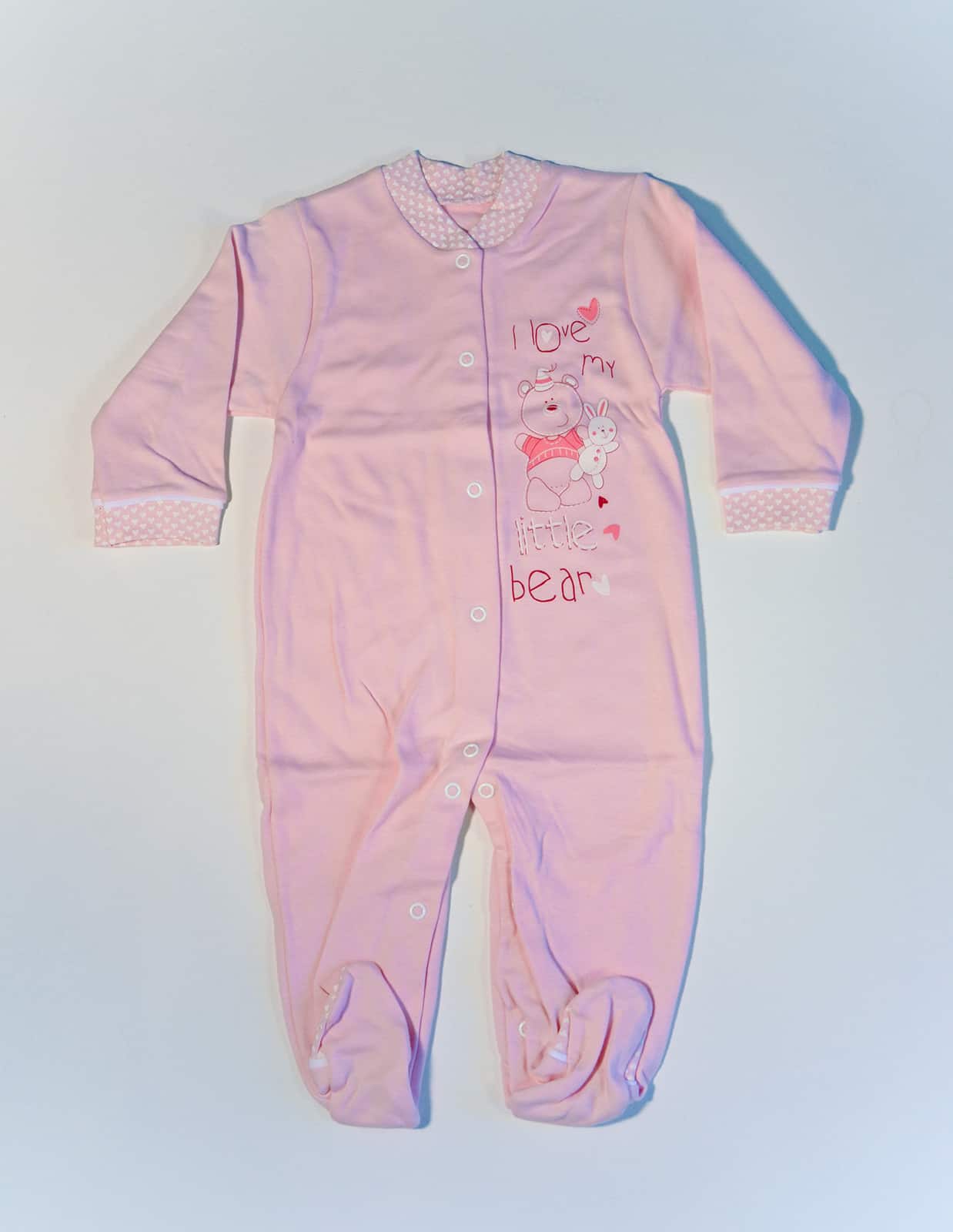 Kojenecký overal s praktickým zapínáním na patentky, zdobený veselým potiskem medvídka.