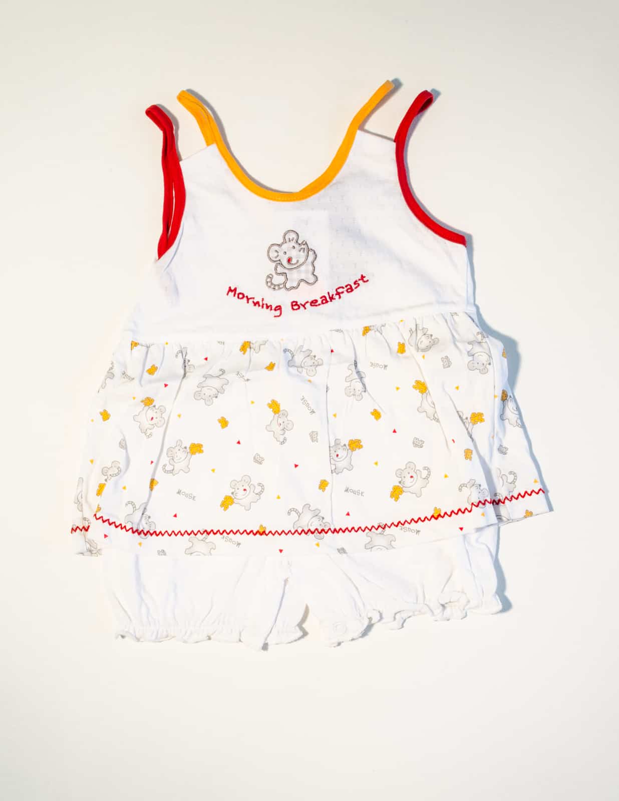 Letní bavlněný overálek, zdobený nášivkou a potiskem.Materiál: 100% bavlnaBarva: Bílá, červenáVelikost: 3M (62) / 6M (68) / 9M (74) celý popis