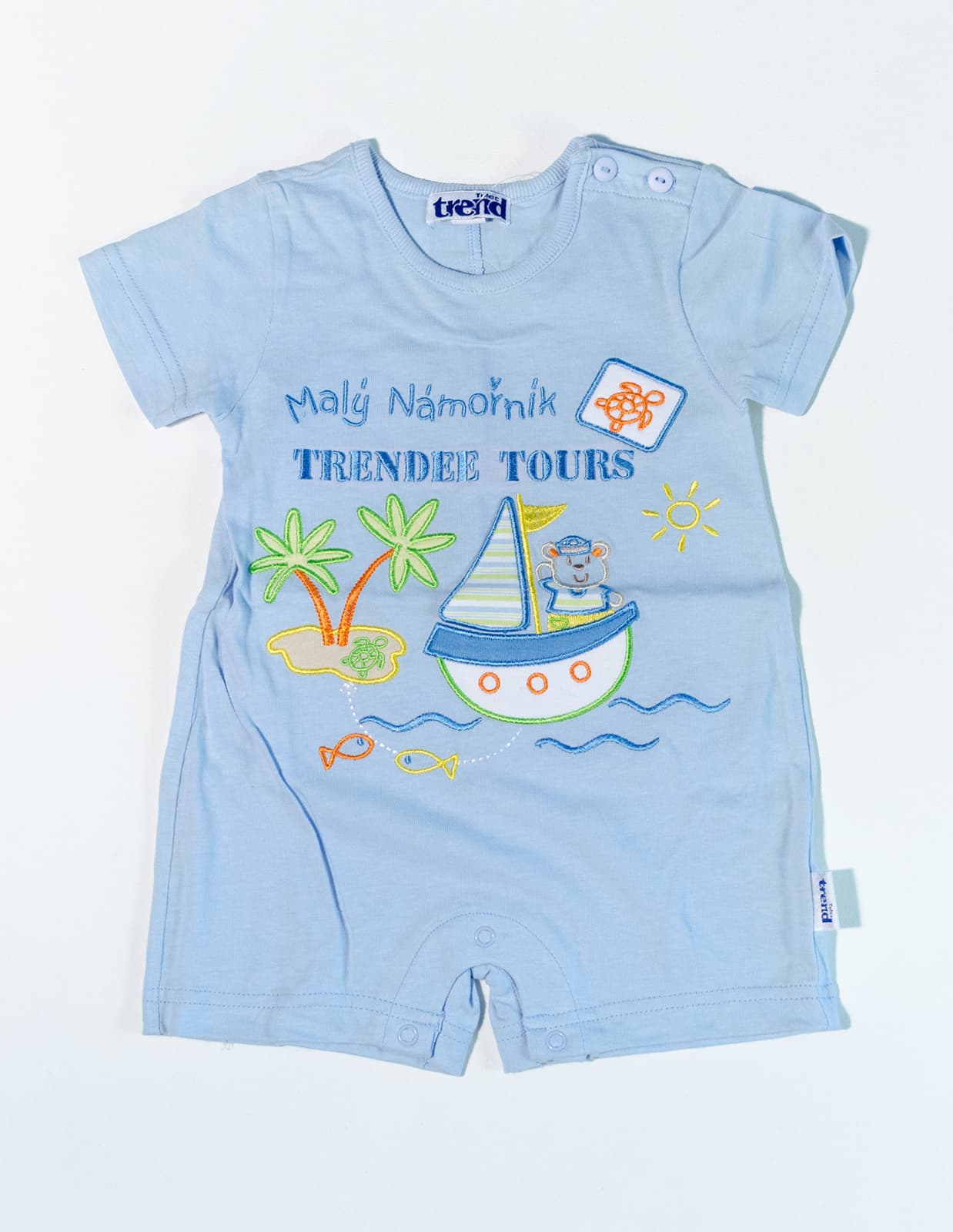 Letní kojenecký overal s krátkým rukávem a nohavičkami, zdobený veselou nášivkou.