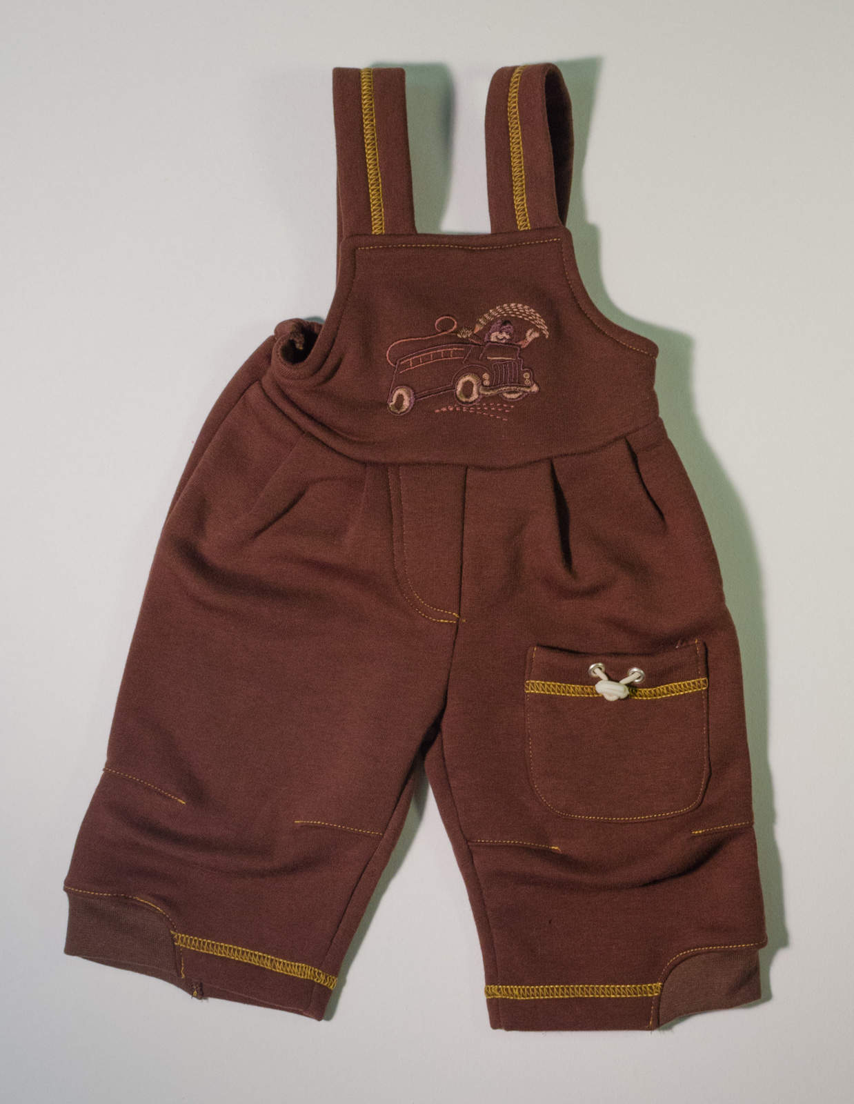 Vyšívané zateplené tepláčky s laclem, s kapsičkou na malé poklady.